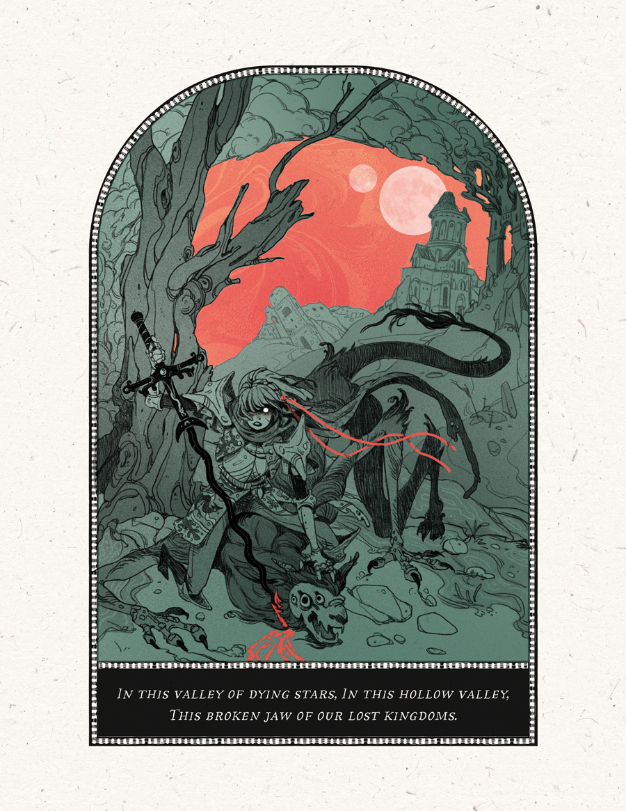 Four color risograph print in flourescent pink, orange, black, and hunter green featuring a line from T.S. Eliot’s poem The Hollow Men.